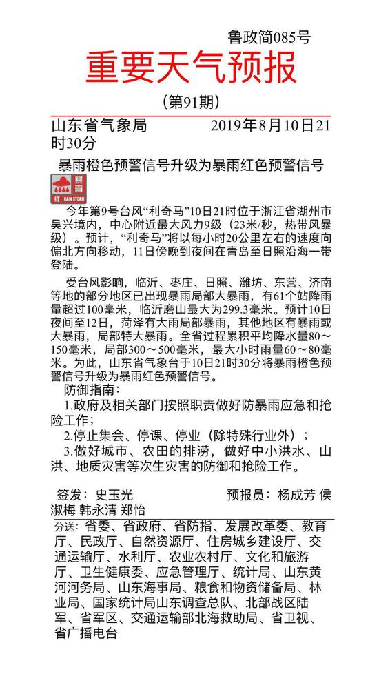 8月10日21时30分,山东省气象局将暴雨橙色预警信号升级为暴雨红色预警信号。