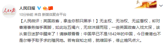 无主权、无治权、无监督权,却对香港事务指手画脚,如此吆五喝六,无非沐猴而冠,一些英国政客入戏太深,该从昔日迷梦中醒来了!请睁眼看看:中国早已不是1842年的中国,今日香港也不是尔等予取予求的殖民地。若有自知之明,就缩回手,停止煽风点火。