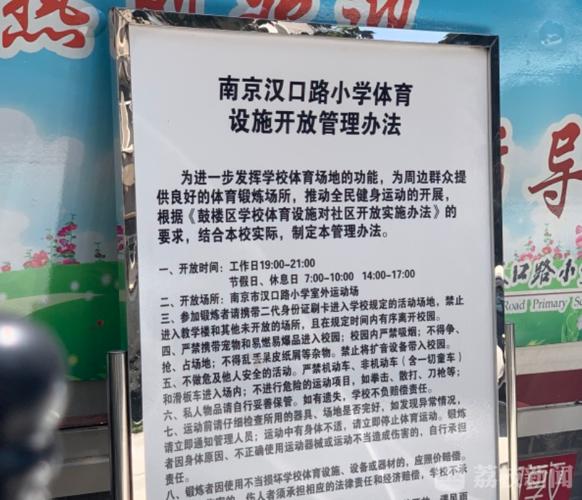 南京市汉口路小学在校门左手边,摆放了该校体育设施开放管理办法,对开放时间、开放场地、可从事运动和预约电话等事项做出明确公示。工作人员告诉记者,只要在规定开放时间,就可以到学校运动。