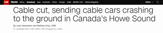 CNN援引加拿大广播公司消息称,这跟被切断的电缆直径约有2英寸(约5厘米)粗,而“海天缆车”最近刚刚对这条线路进行过维护。报道称,在电缆被切断后,这跟电缆上全部30辆缆车几乎全部掉到了地上。