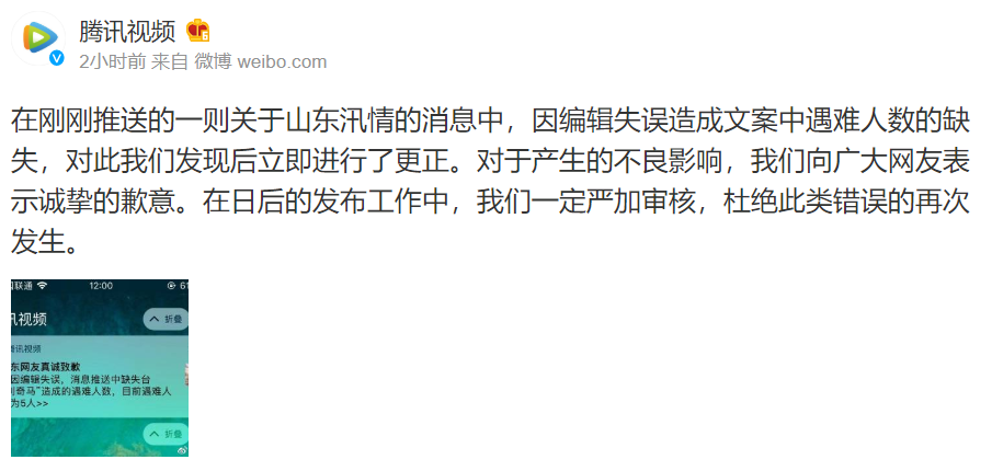 在刚刚推送的一则关于山东汛情的消息中,因编辑失误造成文案中遇难人数的缺失,对此我们发现后立即进行了更正。对于产生的不良影响,我们向广大网友表示诚挚的歉意。在日后的发布工作中,我们一定严加审核,杜绝此类错误的再次发生。