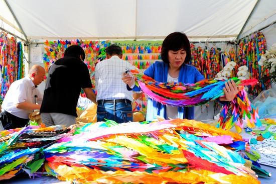 火灾现场附近的献花台上,日本民众摆了5万只千纸鹤(朝日新闻)