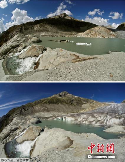 资料图:十年前后在隆河冰川同一地点的对比图。由于全球变暖冰川融化,昔日的隆河冰川冰面有明显缩小。