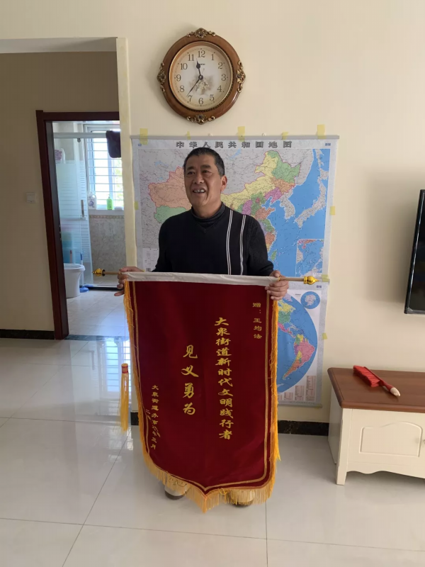 获救学生家长根据现场市民提供的照片,事后次日在附近河边向锻炼的市民打听,最后有人认出下河救人的这位老人叫王均法,家住大泉街道办事处辖区,是一名退休职工,今年60多岁了。王均法救人的事迹在当地传为美谈,邻居问他当天这么冷,都一把年纪了,下河救人万一出现危险咋办?王均法说:“救人要紧,我没想那么多。”大泉街道办事处领导和群众经过评选,决定授予王均法“新时代文明践行者”的称号,并向他颁发了一面锦旗。