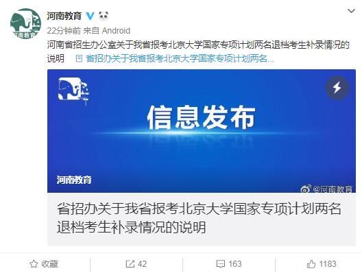 河南省招生办公室关于我省报考北京大学国家专项计划两名退档考生补录情况的说明