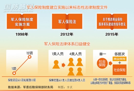 经过多年不懈努力,我军以2012年施行的《军人保险法》为统领、以10多个保险项目为主干,以社会保险为基础、以商业保险为补充的广覆盖、多层次、兜底线的军人保险法律制度体系初步形成。