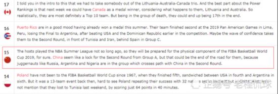 不过,需要指出的是,在FIBA给出的各大参赛球队热身赛追踪总链接里,并没有中国男篮热身赛的统计,这或许和男篮比赛官方统计网站不方便寻找,亦或是没有相关英文版报道有关。而如果能有相关的比赛结果,最近热身赛不断取胜的中国男篮,排名或许还会超高,因为这本身就是一个加分项,而FIBA记者在做排名时,也只能根据相关的比赛结果做一个理论上的分析,不可能对32支球队的所有人员组成甚至是融入情况、最终实战效果有非常权威的球探报告,都只能点到为止,从纸面上做出比较浅显的分析。