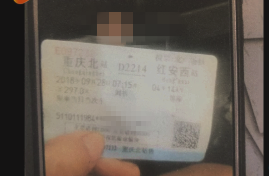 雷某带着妞妞乘坐的重庆北至红安西的高铁票