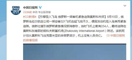 【引擎吸入飞鸟 俄罗斯一架客机紧急迫降莫斯科市郊】8月15日,俄罗斯乌拉尔航空公司一架空客321飞机在起飞后不久,便因发动机吸入鸟类而紧急迫降。俄新社援引俄罗斯紧急情况部消息称,当时飞机上载有234人,最终迫降在莫斯科东南部的茹科夫斯基机场(Zhukovsky International Airport)附近。该航班计划从莫斯科飞往克里米亚的辛菲罗波尔,机上没有人员伤亡。