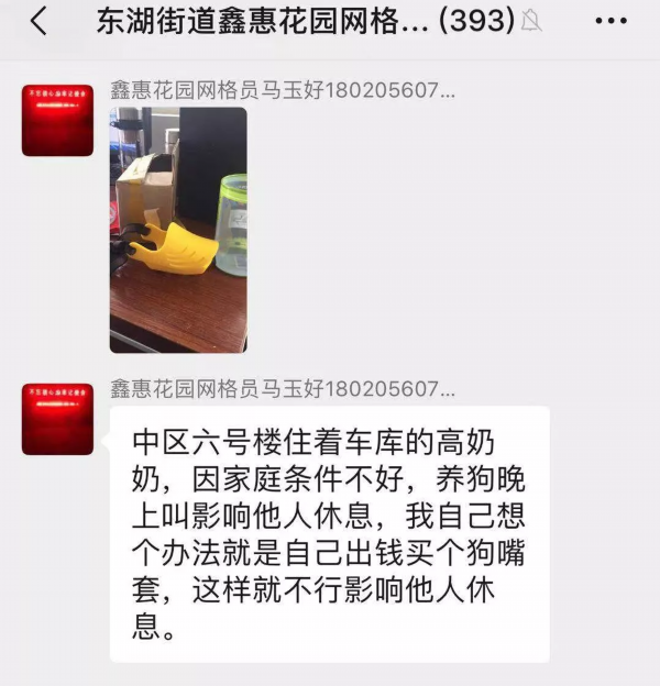 在群里,记者还看到,这几天有不少居民反映小区六号楼车库的高奶奶家养的狗夜里总是叫唤,影响居民们休息,但是考虑到奶奶家庭条件不好,马玉好便自己出钱买了狗嘴送给奶奶。