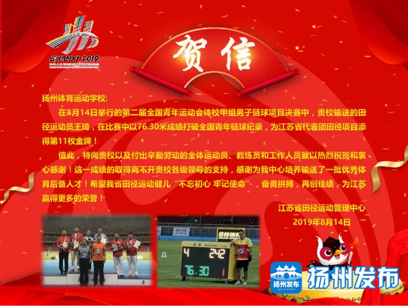 今天一大早,扬州市体校就收到了一封来自江苏省田径运动管理中心的贺信。