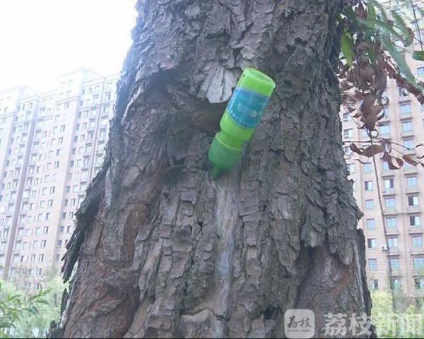 昨天上午,在句容城区肖杆路旁,记者看到树上挂着瓶子,瓶子呈绿色,瓶身上写着“树医生啄木鸟”等字样。这个绿色瓶子到底是什么?有什么用?记者来到了园林管理中心了解情况,园林管理中心相关负责人介绍,这个绿色的瓶子的确是他们插在树上的,主要防治天牛对树木的危害。