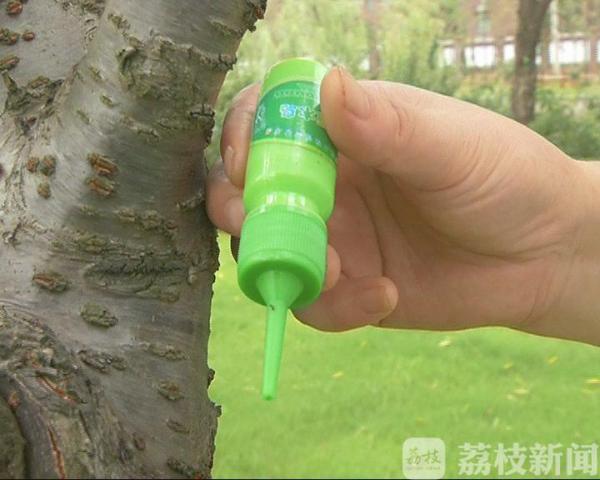 句容市城管局园林管理中心养护科园林工程师李文翠告诉记者,“这个是一种治疗树杆害虫的药水,名字叫‘啄木鸟’,它对天牛的成虫、幼虫有触杀和胃毒熏蒸作用,因为树叶里面的药液可以根据树木的流动上下传导,不管成虫还是幼虫,它都有防治作用。”