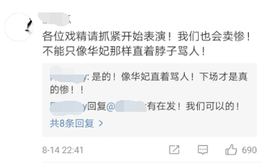 比如下面这两位“粉丝”就表示,大家不能只和这些极端分子硬刚,不能只去骂他们,还要争取更多人的支持,要学极端分子那样去“卖惨”。其中一位粉丝还表示,大家要活学活用《甄嬛传》、《延禧攻略》的斗争技巧:
