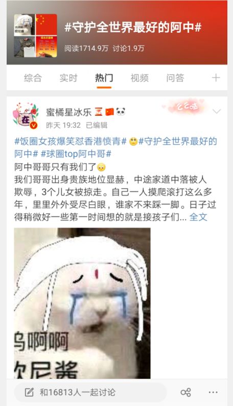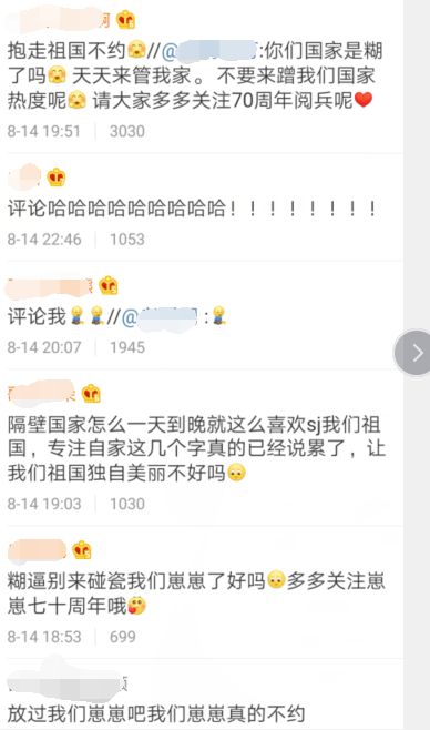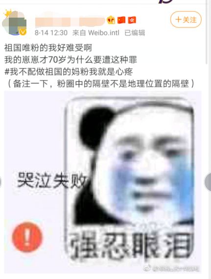但更有趣的事情还在后面——随着越来越多不同明星的粉丝投入这场普通网民层面的“舆论混战”,这些粉丝们也开始从给某一位明星“应援”,逐渐凝聚成了一体,并开始有了一个共同的“应援”新对象——那就是被ta们“拟人化”、并称为“阿中”和“70岁仔仔”的中国!