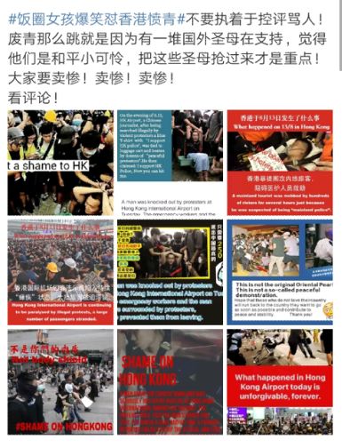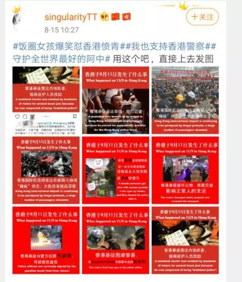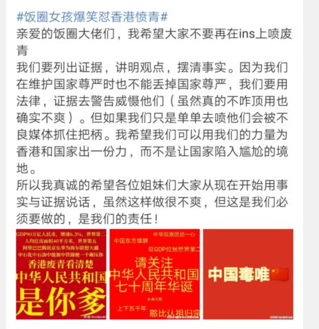 于是,在过去这几天,这些不同艺人的粉丝们,都纷纷放下了原本饭圈内部的“吵嘴”与“互撕”,纷纷来到这些境外的社交平台上:一边给“爱豆”鼓劲打气,一边则与他们的“爱豆”一起反击起香港那些极端分子和暴徒来。
