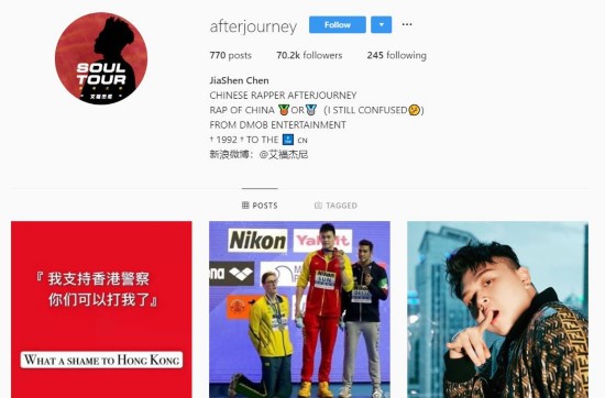 如上图所示,在周二香港机场的那些极端示威者和想彻底搞乱香港的暴徒们袭击了一名内地游客和一名《环球时报》的记者后,包括中国嘻哈歌手VaVaMiss、艾福杰尼、Melo谢宇杰,以及艺人张艺兴等人,都在他们开设在境外社交平台Instagram的账号上,同步了他们支持香港警察,谴责暴徒袭击记者和无辜游客暴行的内容。
