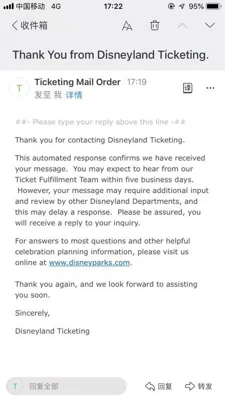 就网友们普遍关心的焦点问题,人民网记者14日通过美国迪士尼度假区官网邮箱进行了问询。随后收到邮件回复称:提问已收到,一般将在5个工作日内答复;你提的问题可能需要其他部门介入,因此回复有可能推迟。邮件的落款是“Disneyland Ticketing(迪士尼乐园票务)。随后记者于15日上午通过上海迪士尼度假区官网邮箱进行了问询,截至发稿前尚未收到回复。