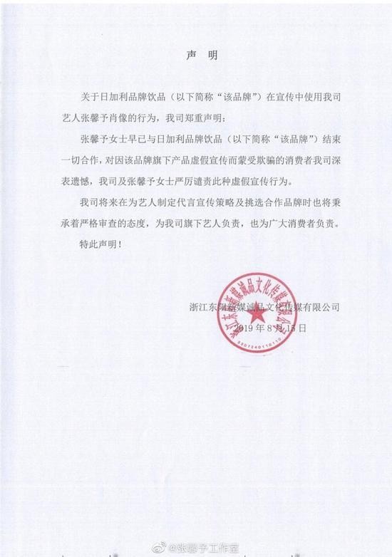 就在该微商被开出巨额罚单后,有不少网友关注到,微商在宣传中使用了艺人张馨予的照片作为宣传,引起不少关注。8月16日凌晨,张馨予工作室回应表示,张馨予早已与日加利品牌饮品结束一切合作,对因该品牌旗下产品虚假宣传而蒙受欺骗的消费者公司深表遗憾,公司及张馨予女士严厉谴责此种虚假宣传行为。公司称将来在为艺人制定代言宣传策略及挑选合作品牌时也将秉承着严格审查的态度,为公司旗下艺人负责,也为广大消费者负责。
