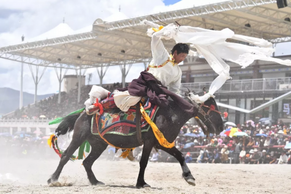 8月12日上午,赛马场进行的是马5000米决赛、赛牦牛等传统体育项目。在马术表演项目中,来自各地的骑手向观众展现了自己精湛的骑术,选手和马配合默契,精彩刺激的表演赢得了场外观众的阵阵欢呼。