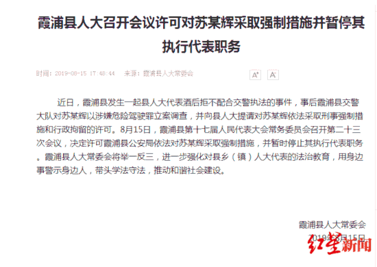 8月15日下午,针对“县人大代表苏某辉醉驾被查不配合执法”一事,福建宁德市霞浦县人大常委会发布情况通报称:近日,霞浦县发生一起县人大代表酒后拒不配合交警执法的事件,事后霞浦县交警大队对苏某辉以涉嫌危险驾驶罪立案调查,并向县人大提请对苏某辉依法采取刑事强制措施和行政拘留的许可。8月15日,霞浦县第十七届人民代表大会常务委员会召开第二十三次会议,决定许可霞浦县公安局依法对苏某辉采取强制措施,并暂时停止其执行代表职务。