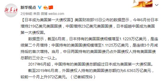 美国财政部15日公布的数据显示,今年6月份日本增持219亿美元美国国债,中国增持23亿美元美国国债,日本超越中国成为美国第一大债权国。