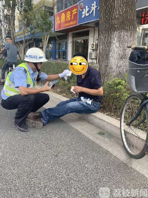 原来,该男子中午和朋友聚餐时喝多了,迷迷糊糊地骑着自行车归家,结果没骑多远,就一头栽进了绿化带,造成了面部些许擦伤。民警仔细查看伤情后,为该男子擦去了脸上的血。