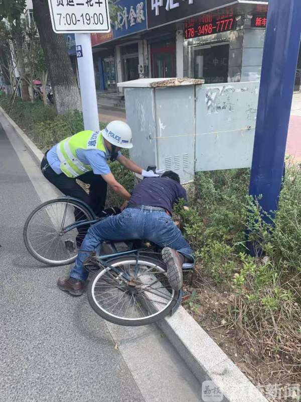昨天(8月15日)下午2点左右,江苏沭阳交警一中队民警黄乐园带领辅警朱延祥在辖区执勤巡逻,行驶至沭阳虞姬桥附近时,突然发现一男子背部朝上趴在路边的绿化带上,更让人惊讶的是,该男子和绿化带之间还隔着一辆自行车。