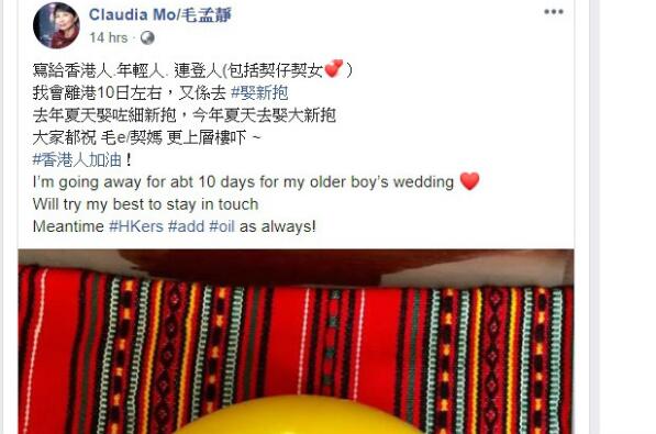 继“港独”头目罗冠聪8月14日在社交媒体上表示自己离开香港前往耶鲁大学学习之后,8月15日晚,香港反对派议员毛孟静也在社交媒体上发文称,因为大儿子要娶妻,她将离开香港十天左右,文尾还不忘称“会为香港人加油”。