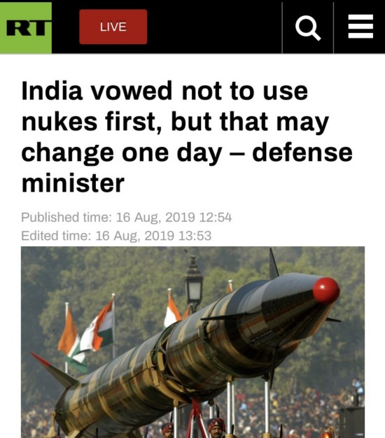 RT称,辛格作出如此警告之际,正值印巴这两个拥有核武器的国家之间的紧张局势持续升级。