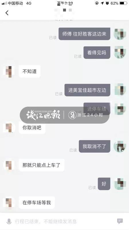 郑师傅直接回了一句“不知道”,小李继续发信息,“进美宜佳超左边,进停车场”,郑师傅回复道,“你取消吧”。