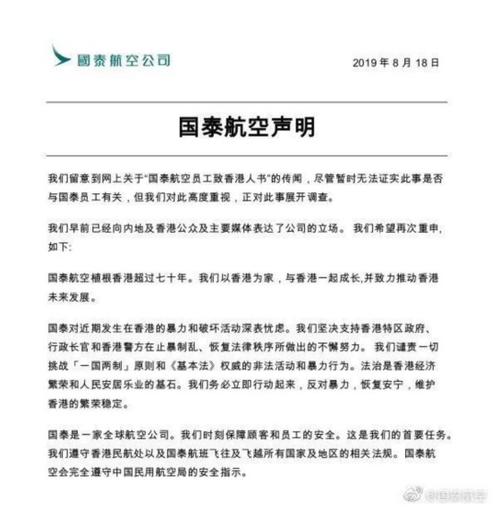 国泰对近期发生在香港的暴力和破坏活动深表忧虑。我们坚决支持香港特区政府、行政长官和香港警方在止暴制乱、恢复法律秩序所做出的不懈努力。我们谴责一切挑战「一国两制」原则和《基本法》权威的非法活动和暴力行为。法治是香港经济繁荣和人民安居乐业的基石。我们务必立即行动起来,反对暴力,恢复安宁,维护香港的繁荣稳定。