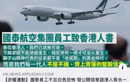 昨日,港媒刊登了一份疑似国泰航空集团员工发表的“致香港人书”,里面充满了煽动性言论,引起了巨大争议。