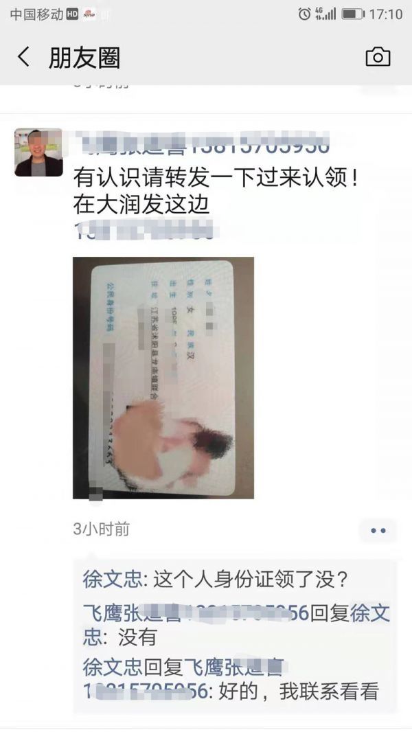 网友在朋友圈发布的身份证招领信息
