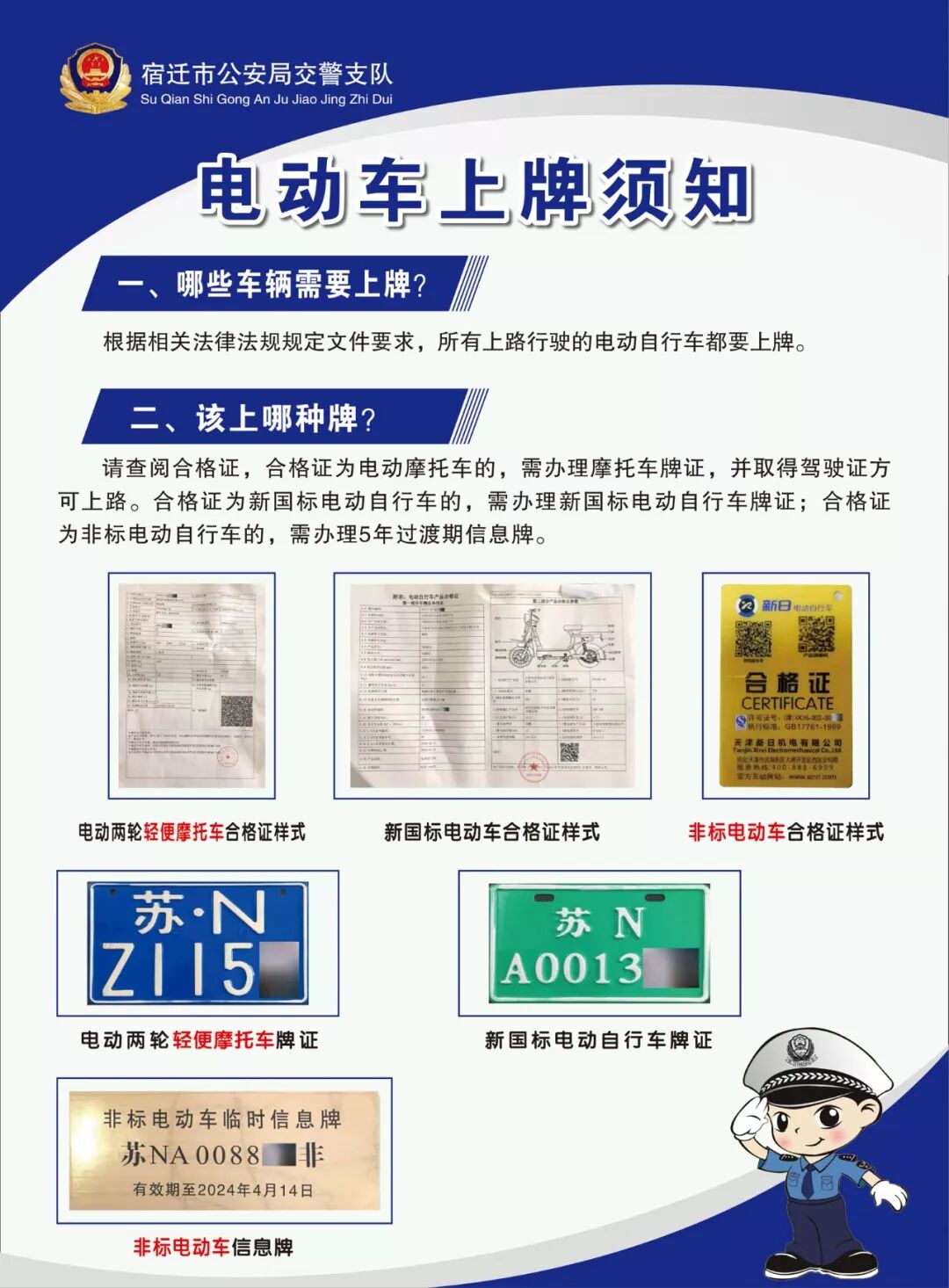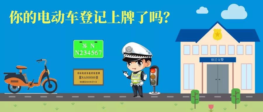 2019年4月12日,宿迁市公安局、宿迁市工业和信息化局、宿迁市市场监督管理局联合发布《关于加强电动自行车生产销售登记工作的通告》,通告中称,所有在用电动自行车应在2019年4月12日至10月14日期间内完成注册备案登记,并悬挂、粘贴电动自行车号牌、临时信息牌。2019年10月15日起,未完成注册备案登记上牌的,不得上路行驶,否则,将依法依规予以查处。
