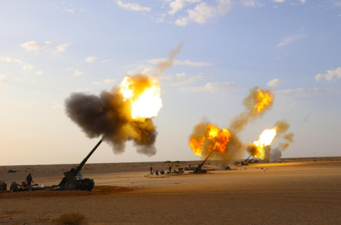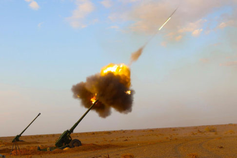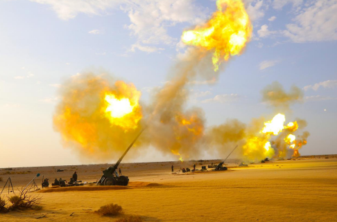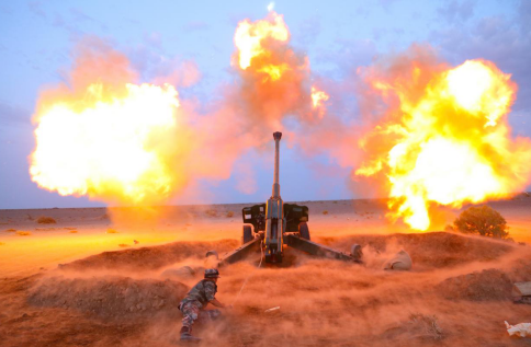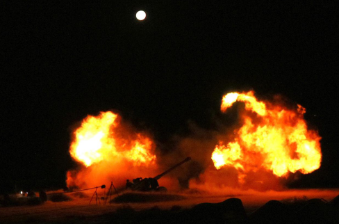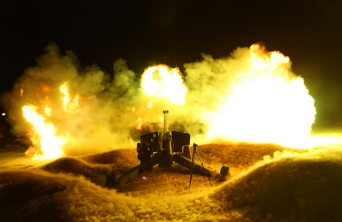 “标尺XX,方向XX,装填!” 弹药上膛,瞄准手装定射击标尺。数十门火炮实施炮兵火力群打击,炮弹同时出膛,直奔目标进行覆盖毁灭性打击。