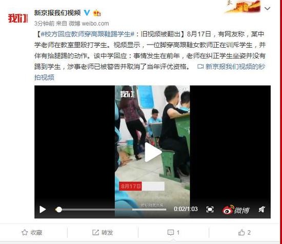 8月17日,有网友称,某中学老师在教室里殴打学生。视频显示,一位脚穿高跟鞋女教师正在训斥学生,并伴有抬腿踢的动作。该中学回应:事情发生在前年,老师在纠正学生坐姿并没有踢到学生,涉事老师已被警告并取消了当年评优资格。