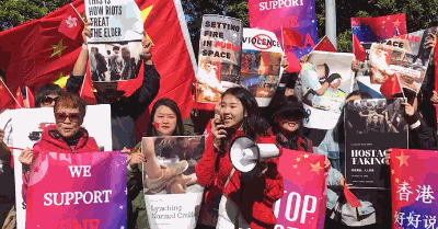 ▲留学生和爱国华人们举行“爱国沪港”和平游行,他们秩序井然地挥舞国旗,高喊“撑警队,惩暴徒”等口号 (图via网络)