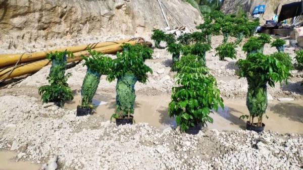 漳浦蔡坑矿区、长桥矿区生态破坏严重,在督察组进驻后,当地政府紧急要求矿主复绿,企业将大量盆栽苗木简单覆土,甚至直接摆放在场地,搞“盆栽式复绿”。漳浦绿地建材贸易有限公司自2014年起在绥安镇违法开山采砂,数百亩山体、林地遭到严重破坏,长期无人过问,2019年7月19日,督察组检查当天,该砂场在既没有拆除设备,也未对场地进行覆土的情况下,直接在砂石、混凝土地面上铺设草皮,应付了事。现场检查时,多数草皮已经枯死。