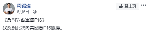 中国国民党籍前台北县县长周锡玮此前曾在脸书上发文《反对对台军售F-16》,还在留言区回复岛内网友:拒绝凯子“国防”。