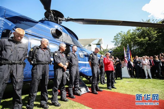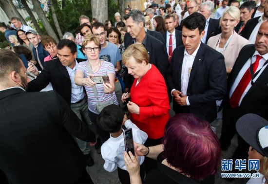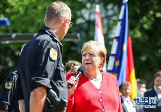 8月18日,在德国首都柏林,德国总理默克尔(中)参加开放日活动。新华社记者 单宇琦 摄
