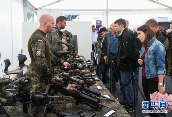 8月18日,在德国首都柏林,两名德国联邦国防军成员向参观者介绍武器装备。新华社记者 单宇琦 摄