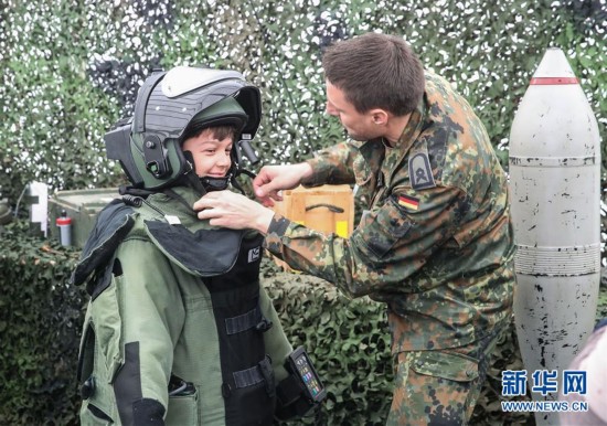 8月18日,在德国首都柏林,一名男孩试穿军事装备。新华社记者 单宇琦 摄