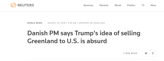 对于美国想购买格陵兰岛的想法,据路透社报道,丹麦首相梅特·弗雷德里克森18日对此回应称,格陵兰岛是非卖品,将其卖给美国的想法很荒谬。弗雷德里克森说,“格陵兰是非卖品。格陵兰并非丹麦所有,格陵兰岛属于格陵兰。我强烈希望这不是认真的。”