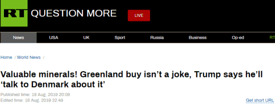 RT称,特朗普认为,买下整个国家都是没有问题的。他表示,这只是“一宗大型房地产交易”,丹麦应该对出售格陵兰岛很感兴趣,因为每年向格陵兰岛投入的7亿美元对丹麦造成了“非常严重”的伤害。