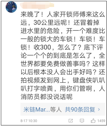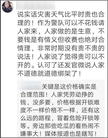 但更多网民对马师傅的做法表示同情和理解,认为锁匠也不容易,凭劳动挣钱,考虑到当时路途遥远,收费300元没有多要。