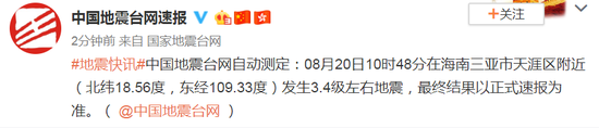 中国地震台网自动测定:08月20日10时48分在海南三亚市天涯区附近(北纬18.56度,东经109.33度)发生3.4级左右地震,最终结果以正式速报为准。( @中国地震台网 )