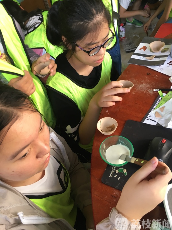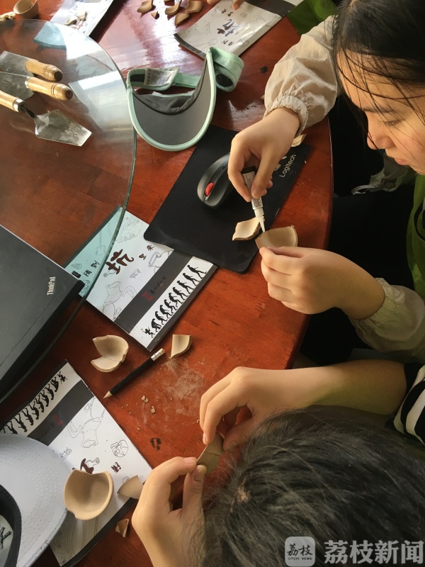 文物修复人员现场演示陶器修复的基本过程,学员们现场体验修复过程。