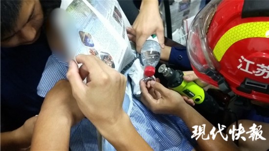 为了安全起见,消防员用报纸将孩子手部和身体隔离开,用手机播放动画片吸引孩子的注意力,同时对螺帽进行切割。切开口子后,消防员又取来两把钳子,拉开切口的距离,最终将螺帽成功取下。