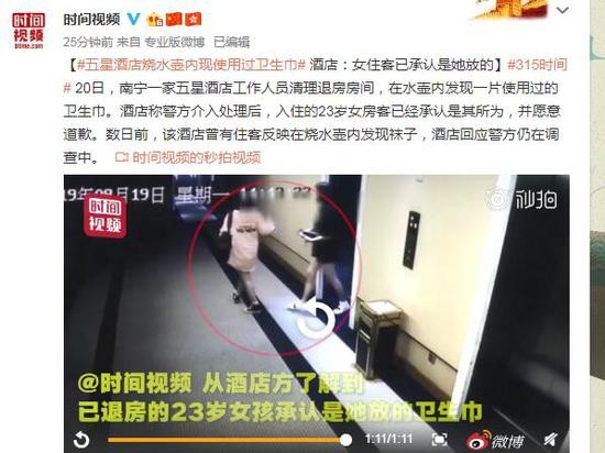 20日,南宁一家五星酒店工作人员清理退房房间,在水壶内发现一片使用过的卫生巾。酒店称警方介入处理后,入住的23岁女房客已经承认是其所为,并愿意道歉。数日前,该酒店曾有住客反映在烧水壶内发现袜子,酒店回应警方仍在调查中。
